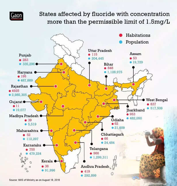 फ्लोराइड की अधिकता की समस्या देश के गिने-चुने गाँवों के निवासियों तक ही सीमित नहीं है। जल शक्ति मंत्रालय के एक दस्तावेज के अनुसार, 18 अगस्त, 2016 तक, देश में 8.5 मिलियन (8,507,634) से अधिक आबादी वाले कम से कम 10,615 बस्तियां उच्च फ्लोराइड वाले पानी से प्रभावित हैं।