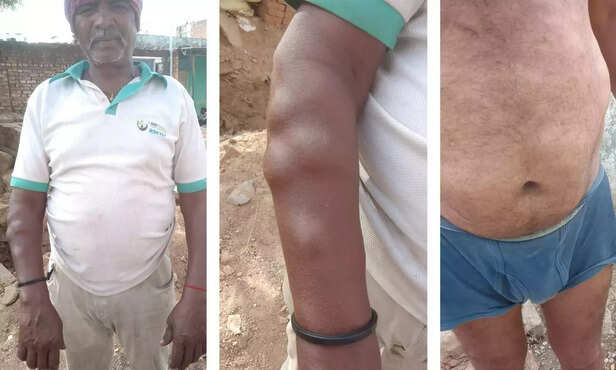 अशोक कुमार तिवारी के हाथ और पेट पर गांठ बन गई है। फोटो: यश सचदेव