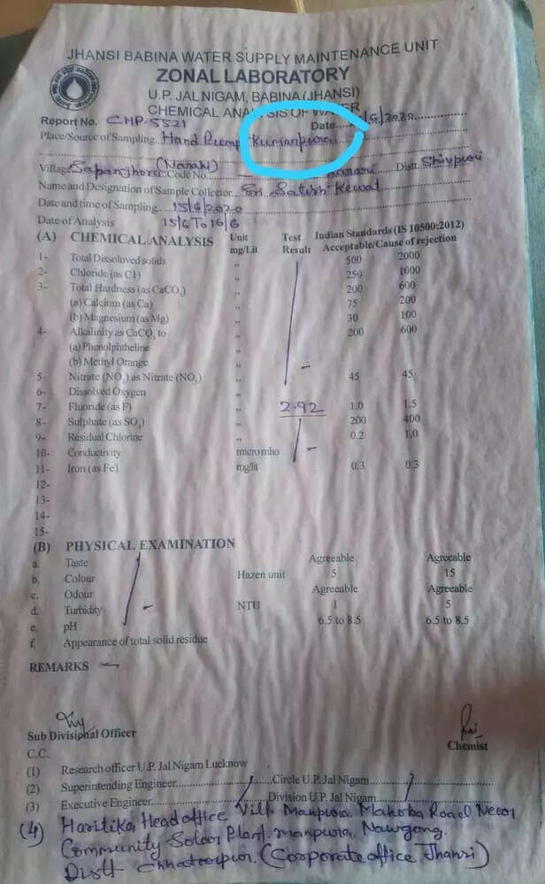 उत्तर प्रदेश जल निगम के तहत झांसी बबीना जलापूर्ति अनुरक्षण इकाई द्वारा 2020 में शिवपुरी के घसराही गाँव में फ्लोराइड की मात्रा 2.5 मिलीग्राम/लीटर पाई गई थी, जब इसके पानी का रासायनिक विश्लेषण किया गया था।