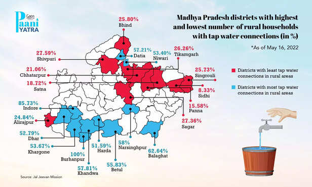 40.35 प्रतिशत के साथ मध्य प्रदेश दस सबसे खराब राज्यों में से एक है, जहां भारत में नल के पानी की आपूर्ति राष्ट्रीय औसत से कम है। जल जीवन मिशन के अनुसार, देश के 49.42 प्रतिशत ग्रामीण घरों में नल के पानी के कनेक्शन हैं।