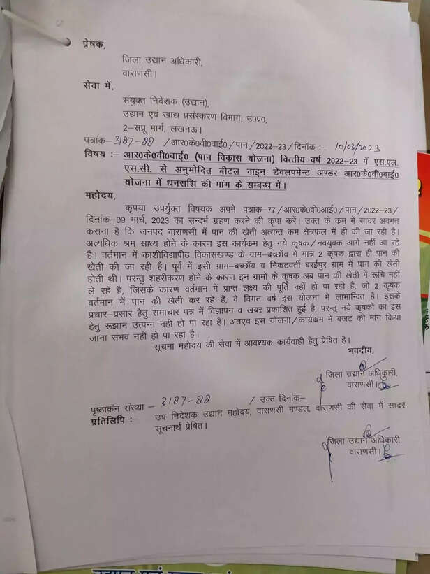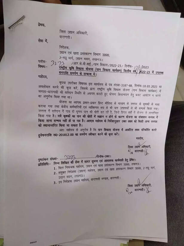 तीन दिन बाद लखनऊ में उद्यानिकी विभाग को संबोधित एक अन्य पत्र में जिला उद्यान अधिकारी ने बताया कि 2022-23 में पान की खेती को बढ़ावा देने के लिए जिले को दिए गए 201,812 रुपये वापस करने हैं।