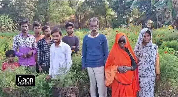 Kushwaha's family poses for a photograph at the field. Today, Kushwaha grows four varieties of marigold flowers — genda, gendi, bijli and nauranga. He invests Rs 50,000 each year to cultivate flowers and now has an annual turnover of Rs 5 lakh (Rs 500,000).