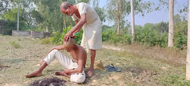 मृतक किसान अनिल कुमार सिंह के परिजन सीतापुर के नैमिषारण्य में क्रिया कर्म करते हुए। फोटो- मोहित शुक्ला