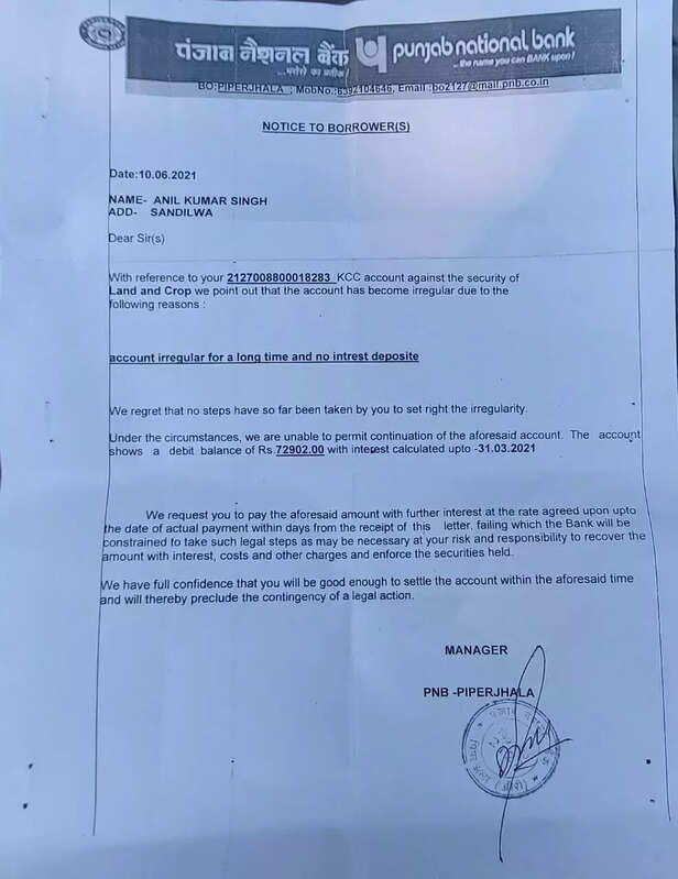 परिवार के मुताबिक उनके पिता के नाम पर सहकारी समिति और पंजाब नेशनल बैंक में करीब 2 लाख रुपए का कर्ज था। 1 जुलाई 2021 को उनके पास सहकारी बैंक की कर्ज़ वसूली का नोटिस आया था, लिखा था कि 76410 रुपए का मूलधन और 43811 का सूद (ब्याज) को मिलाकर कुल 120221 रुपए बाकी है, जिसे आपके वायदे पर अदा नहीं किया है। इस नोटिस के 15 दिन के अंदर कुल धन जमा नहीं कराने पर आपको खिलाफ वैधानिक कार्यवाही की जाएगी। इसके अलावा पंजाब नेशनल बैंक ने 31 मार्च 2021 तक कुल 72902 रुपए किसान क्रेडिड कार्ड के लिए नोटिस जारी किया था।