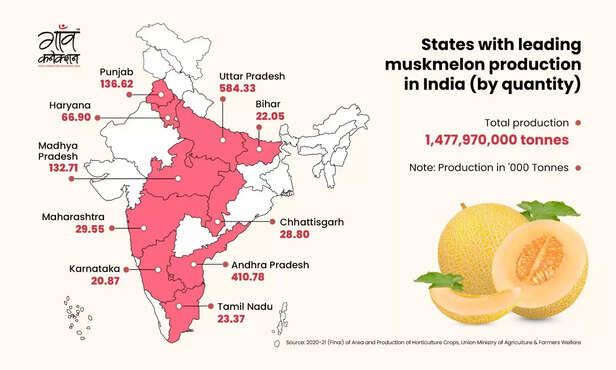 Uttar Pradesh is the largest producer of muskmelon in India, contributing to 39.53 per cent [584,330 tonnes] of the total production in India which is recorded as 1,477,970,000 tonnes by the Union Ministry of Agriculture and Farmers Welfare in 2020-21.