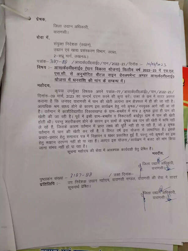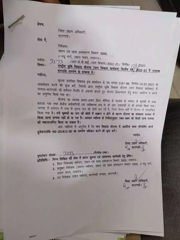 Three days later, in another letter addressed to the horticulture department in Lucknow, the district horticulture officer informed that the latter has to return the Rs 201,812 that had been given to the district to promote paan farming in 2022-23.