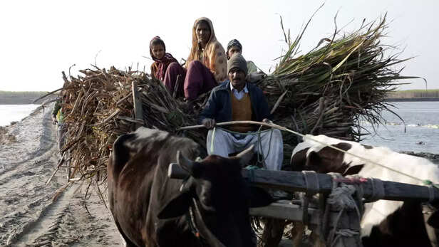 ट्राली वाला हो या बुग्गी वाला किसान, गन्ना का भुगतान उनके लिए एक अहम मुद्दा है। बैलगाड़ी से गंगा पार करता एक किसान। फोटो- मो. आरिफ चीनी का उत्पादन