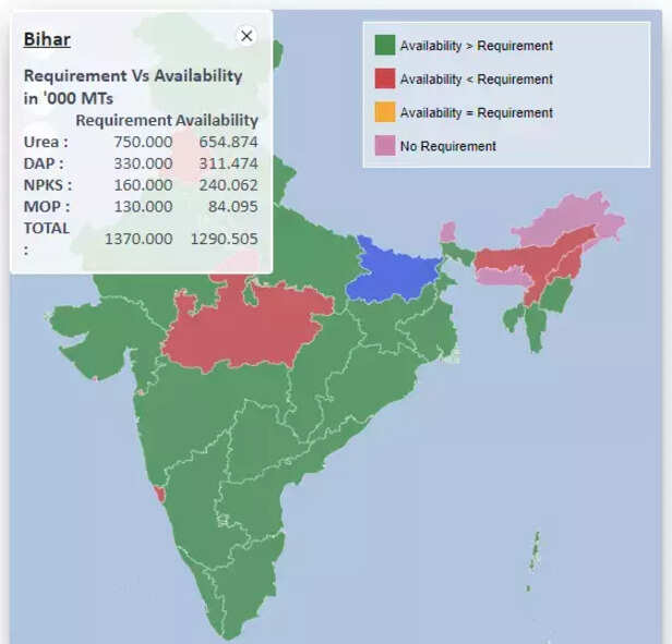 उवर्रक मंत्रालय के आंकड़ों केबिहार में 1 अक्टूबर 2021 से 31 दिसंबर 2021 तक 750.000 हजार मीट्रिक टन की जरुरत थी, जिसके मुकाबले 654.874 हजार मीट्रिक यूरिया की आपूर्ति हुई। वहीं 323.548 हजार मीट्रिक टन की जगह 311.404 हजार मीट्रिक टन डीएपी की उपलब्धता रही है जबकि इसी अवधि 156.452 एनपीकेस की 241.048 हजार मीट्रिक टन की आपूर्ति हुई, 127.741 की जगह 84.095 हजार मीट्रिक टन एमओपी की उपल्धता रही है। सभी नाइट्रोजन और फॉस्फेटिक उर्वरकों को मिलाकर बात करें तो 1 अक्टूबर से 31 दिसंबर तक 1337.419 हजार मीट्रिक टन के मुकाबले 1284.182 हजार मीट्रिक टन की उपलब्धता रही है।