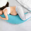 Beautiful sleeping smiling pregnant woman with a big tummy abdomen with long curly hair and closed eyes, hugging a long body pillow with her arm and legs and lying on the bed indoor.