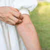 woman showing her skin itching behind , with allergy rash urticaria symptoms